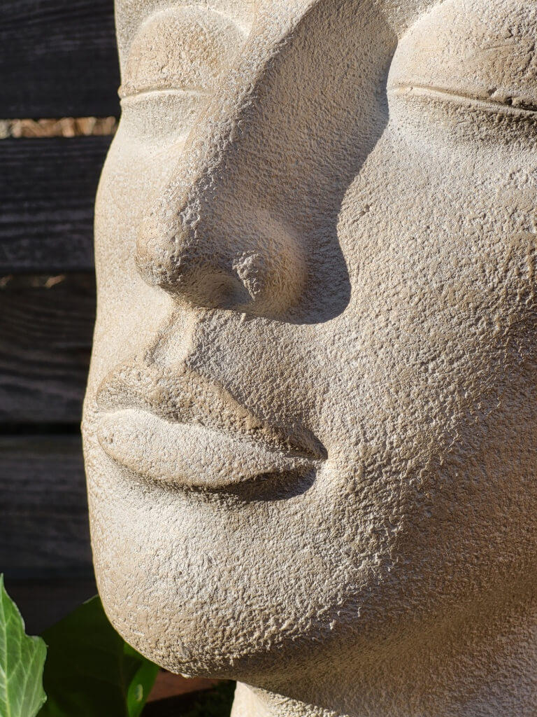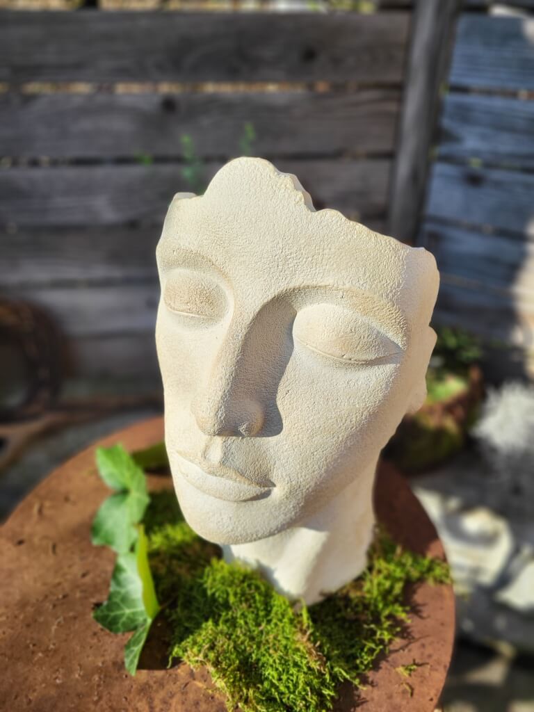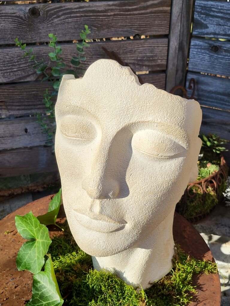 Das moderne Gesicht wirkt bereits ohne Blüten wie eine Skulptur. Er kann durch eine Bepflanzung aber sehr dekorativ in Szene gesetzt werden.