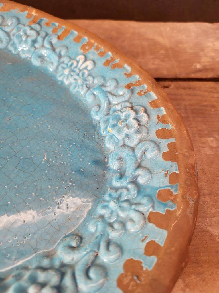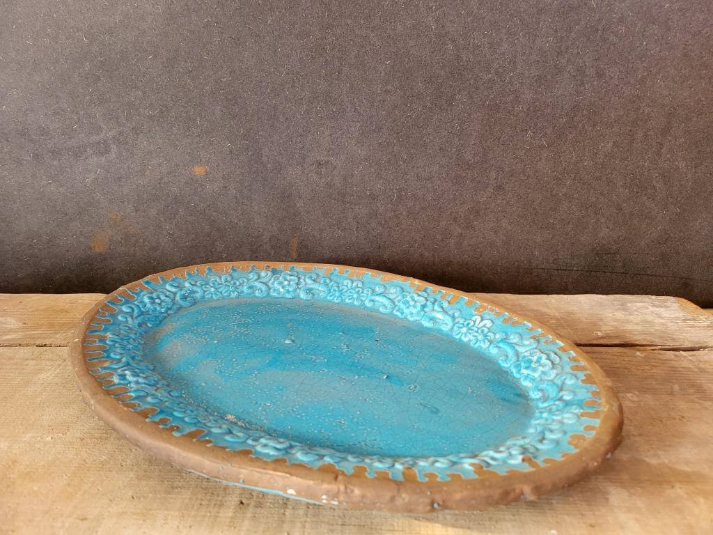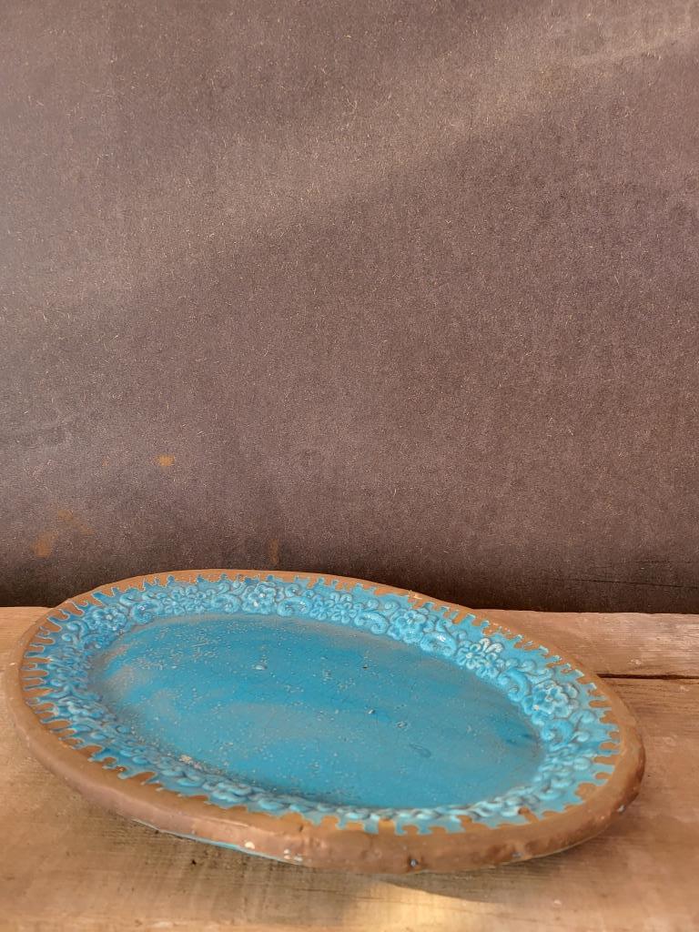 Dieser ovale Steingut Dekoteller ist mit einem wunderschönen reliefartigen Rand verziert, ist in der Knallerfarbe türkis gestaltet und ist ein absoluter Hingucker.
