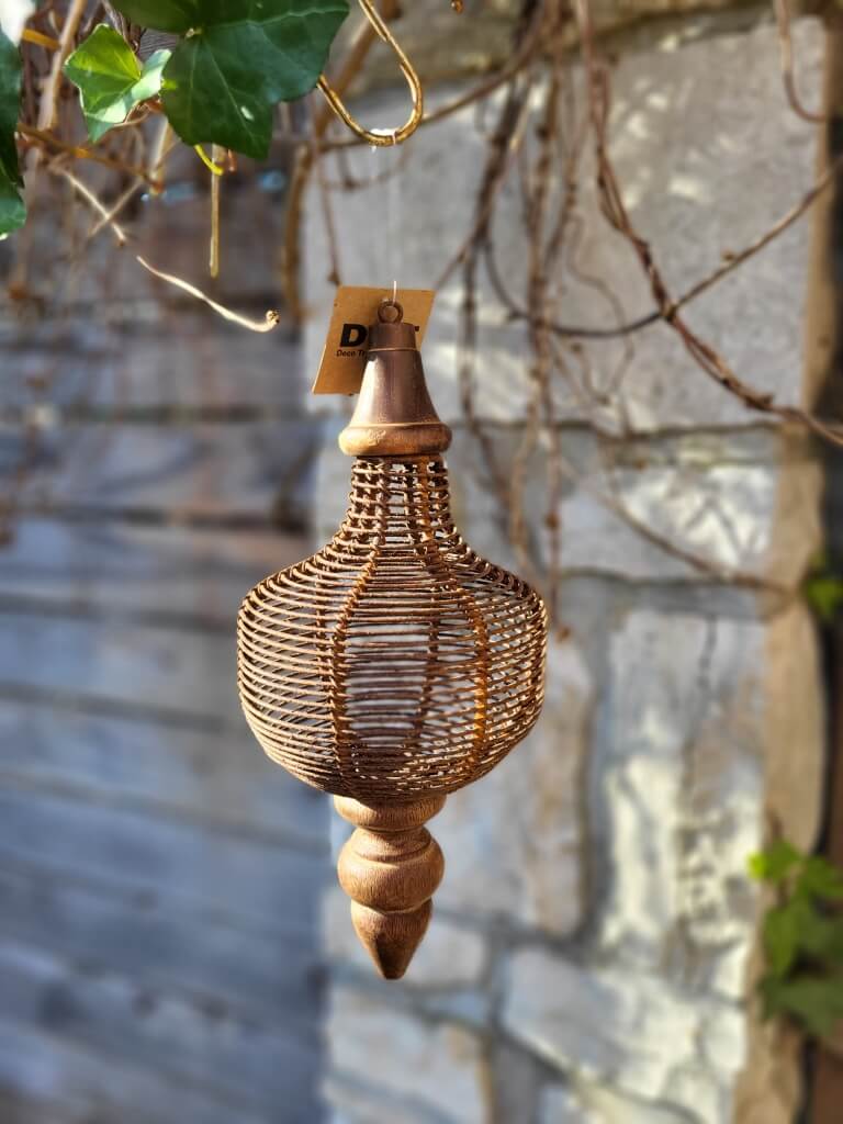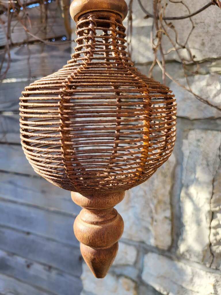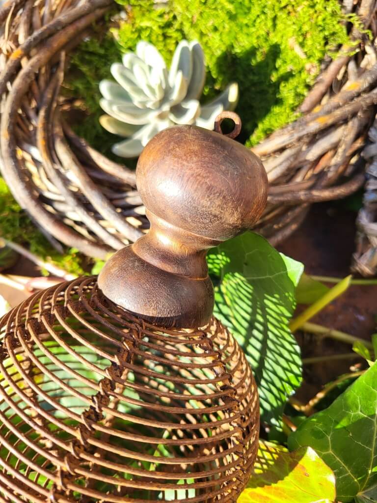 Die mittlere, rundliche Kugel ist aus stabilem Drahtgeflecht und wird an der Ober- und Unterseite von Holzelementen fixiert.