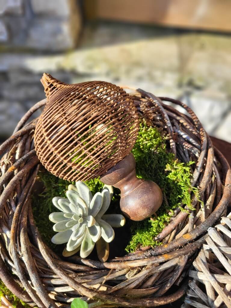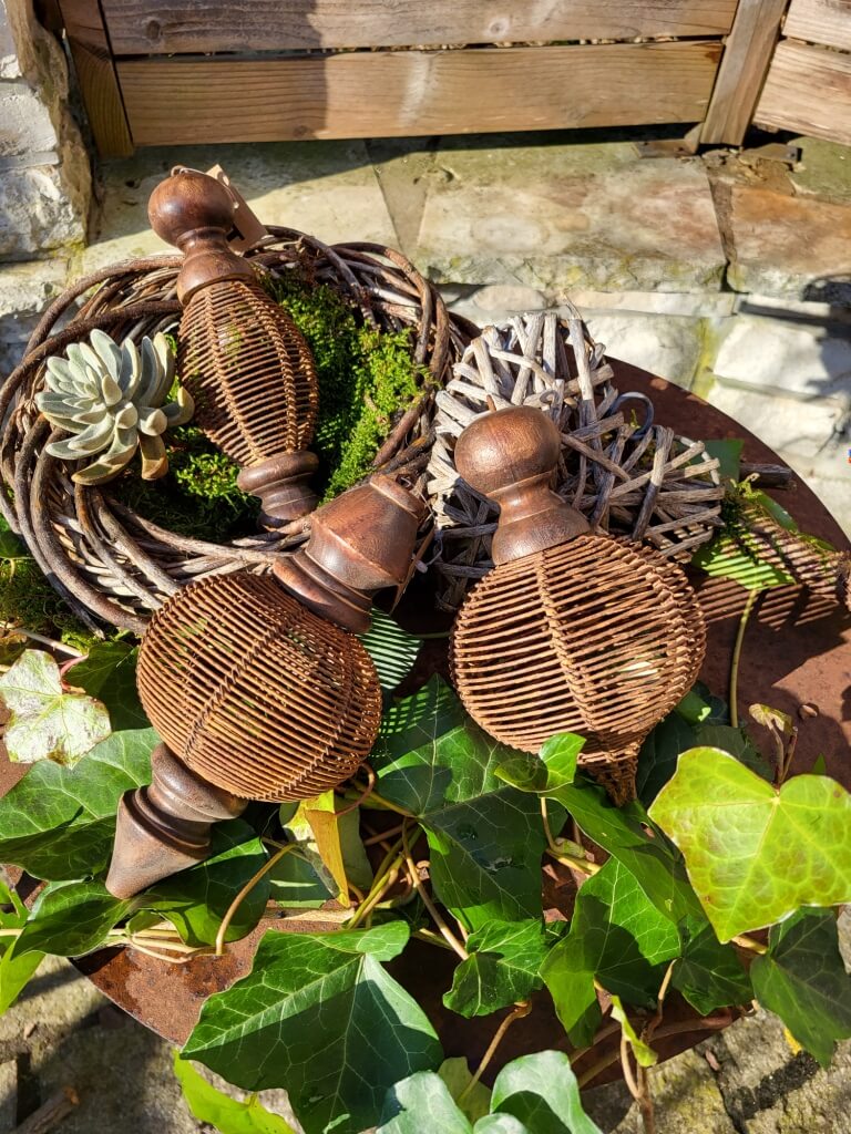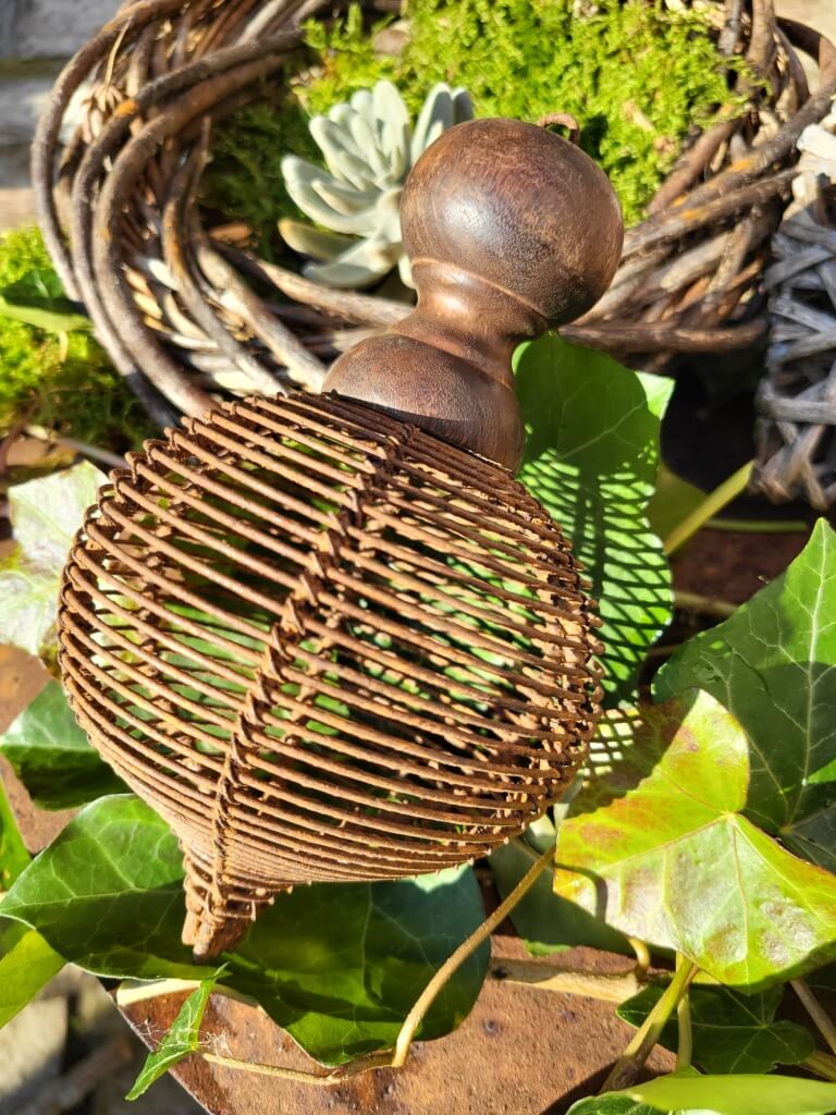 Die mittlere, tropfenförmige Kugel ist aus stabilem Drahtgeflecht und wird nur an der Oberseite von einem Holzelement inkl. Öse zum Aufhängen fixiert.