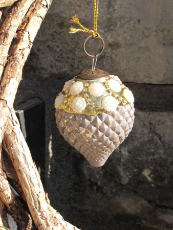 Die Christbaumkugel ist aus Glas gefertigt und besticht durch die Form eines geeisten Kiefernzapfens in einem Rotbraun.
