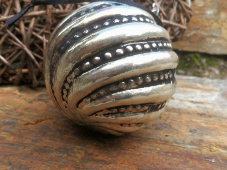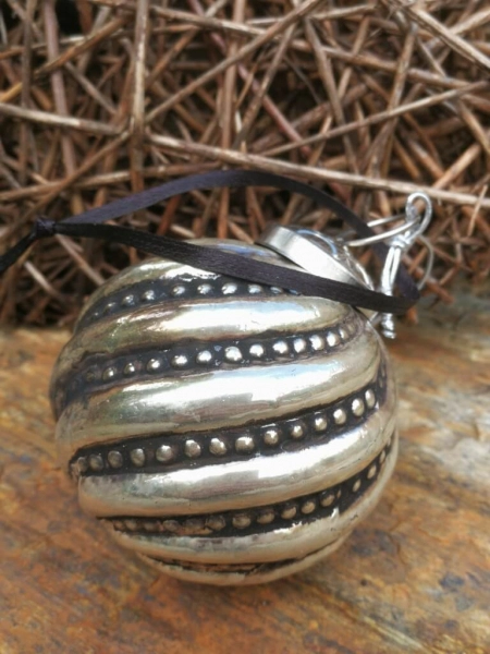 Am oberen Ende der Kugel ist eine silberfarbene, aufwendig verzierte Aufhängung angebracht, inkl. dunklem Band zum Aufhängen.
