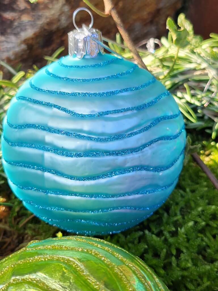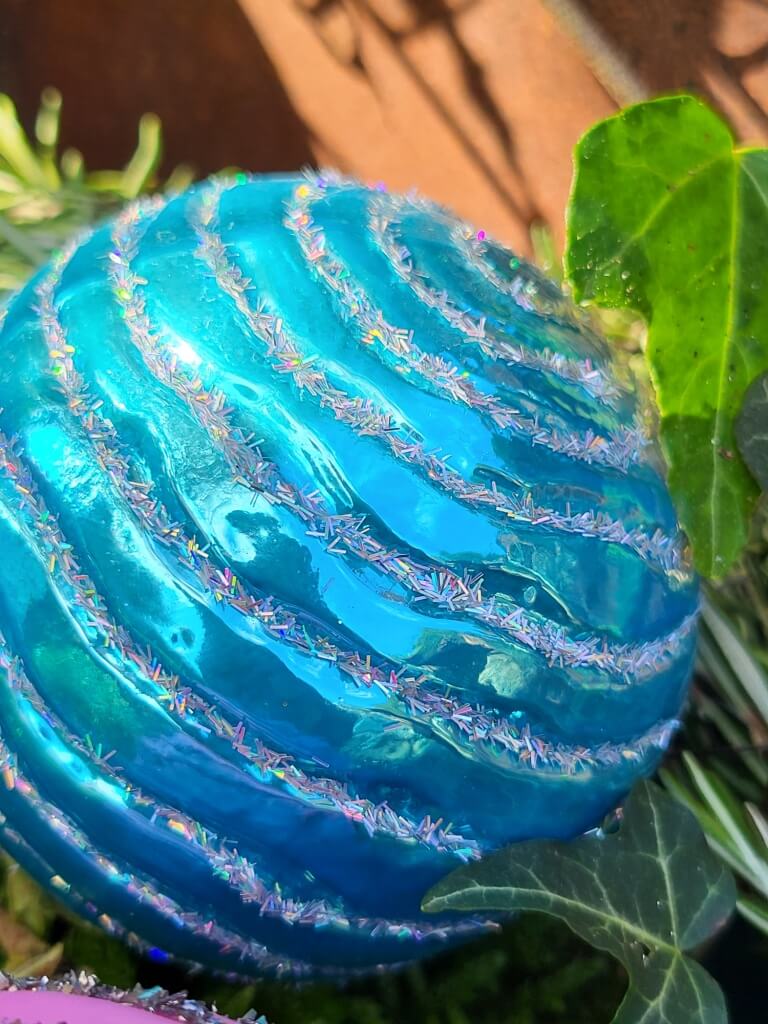 Das 4er-Set besteht aus 1 pinkfarbenen Kugel, 1 grünen und 2 türkisfarbenen Kugeln. Alle sind mit ausreichen Glitzer verziert.