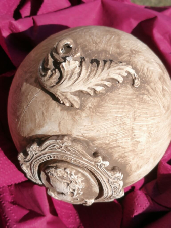 Die schöne Shabby Chic Dekokugel ist mit einem barock amutenden Rahmen und einer detailgetreuen Kamee verziert.