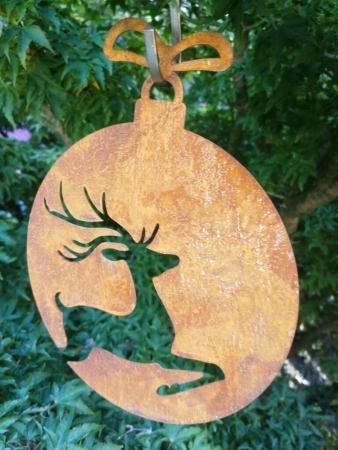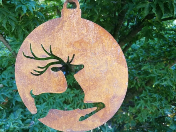 Sehr außergewöhnlich gestaltet ist die Edelrost Christbaumkugel mit einem springenden Hirsch.