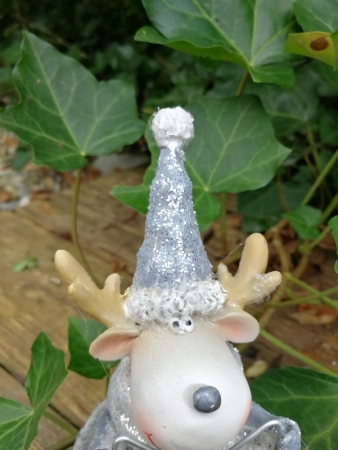 Der putzige, graue Elch besticht durch sein liebenswertes Gesicht und viel Glitzer.