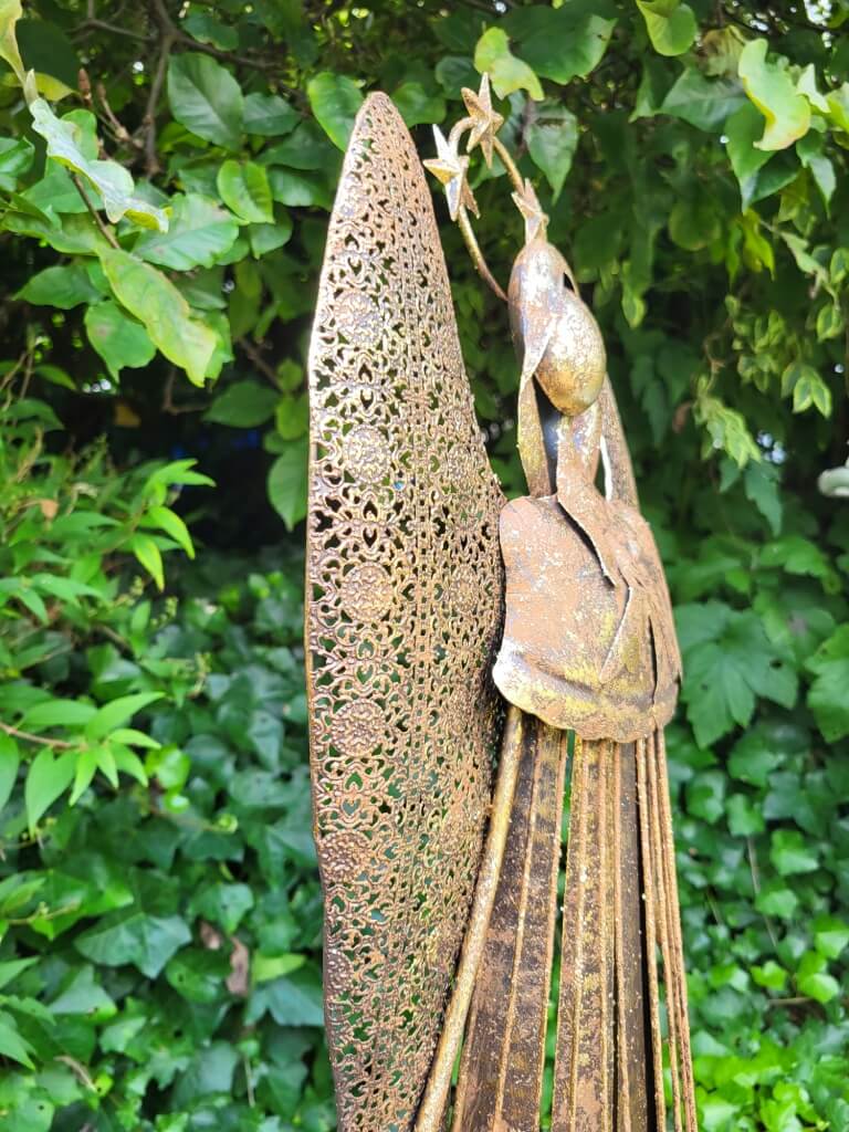 Der besonders ausgefallen gearbeitete Engel ist mit einer gold-rost Patina versehen, die dem ganzen einen edlen Look verleiht.