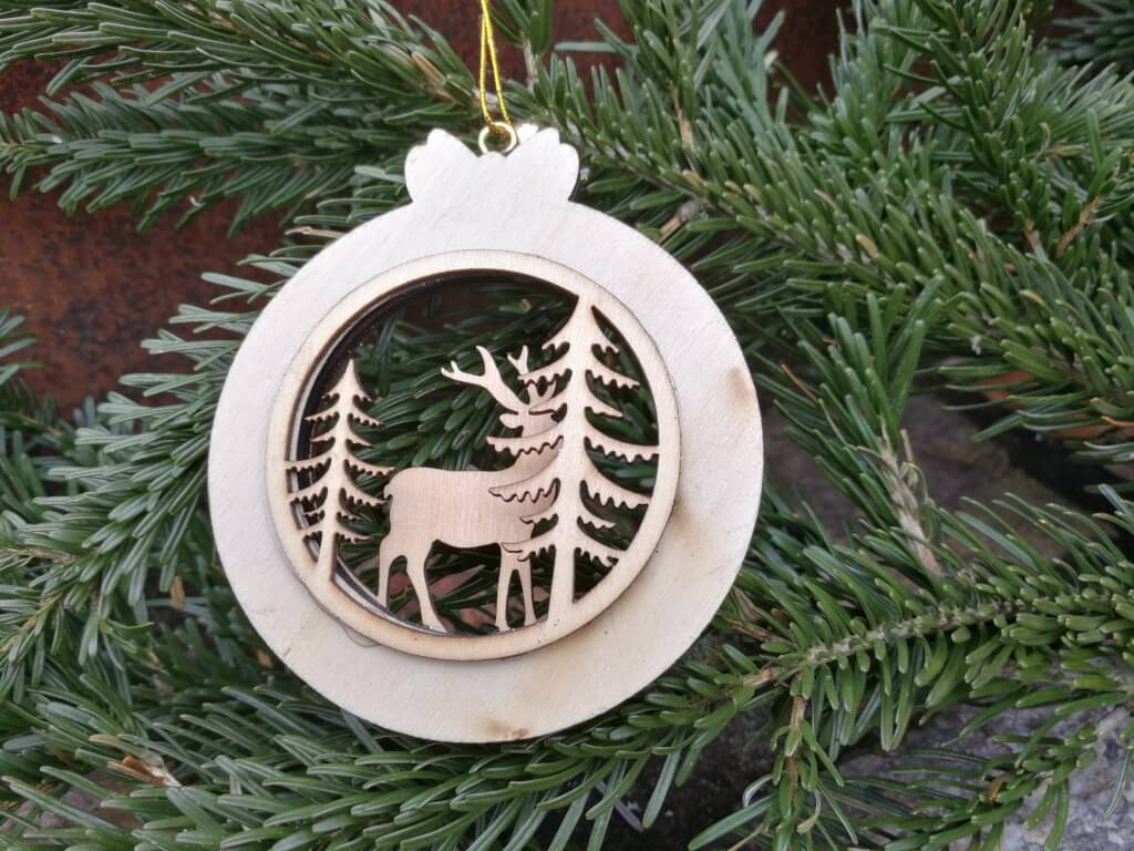 Der Anhänger besteht aus verschiedenen Schichten, wodurch ein 3D-Effekt entsteht. Auf der Vorderseite ist Gold-Glitzer verarbeitet, die Rückseite ist nur in natürlichem Holz. Eine Schnur zum Aufhängen ist bereits angebracht.