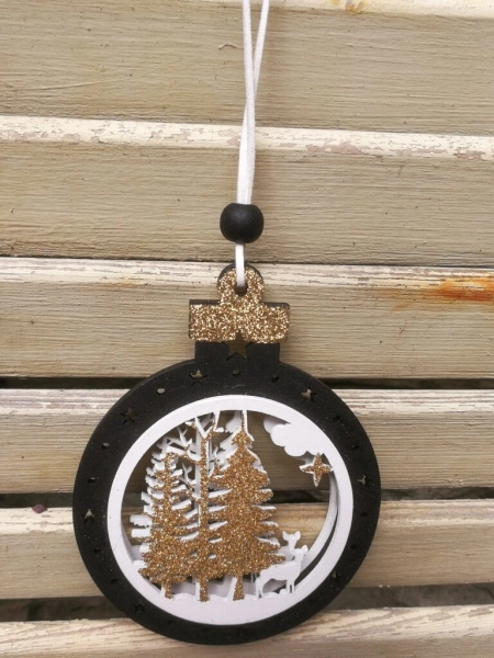 Schwarz, weiß, gold sind die Hauptfarben dieser sehr filigranen und leichten Holzdekoration für Weihnachten zum Aufhängen.