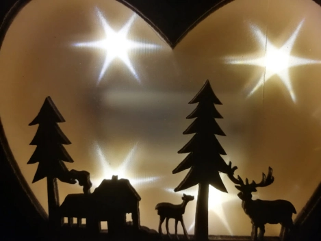 Das schöne Holzherz ist mit einer sehr filigranen Waldszene verziert und zusätzlich mit einer LED-Beleuchtung ausgestattet.