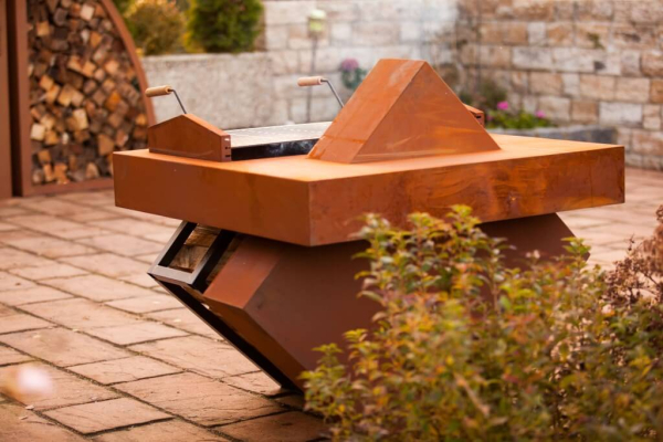 Edelrost Grill "Geometrie" inkl. Grillrost und Holzlege schwarz