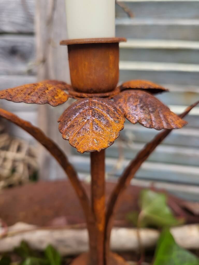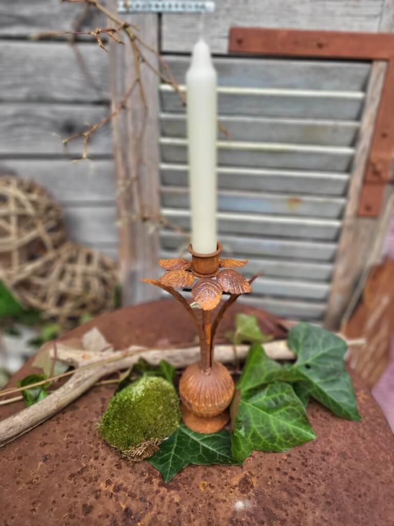 Ein aufwendig und natürlich gestalteter, massiver Edelrost Kerzenhalter in Form einer Blüte mit Blumenzwiebel für Spitzkerzen.