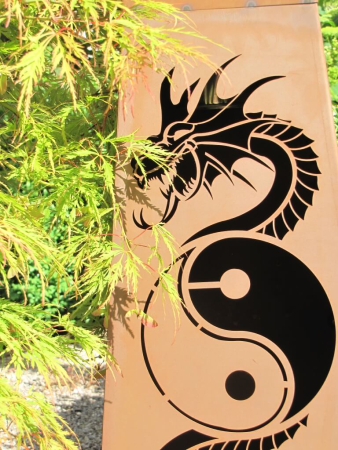 Der Drache mit dem Ying & Yang Zeichen kann sehr schön mit einer elektrischen Beleuchtung von unten in Szene gesetzt werden.