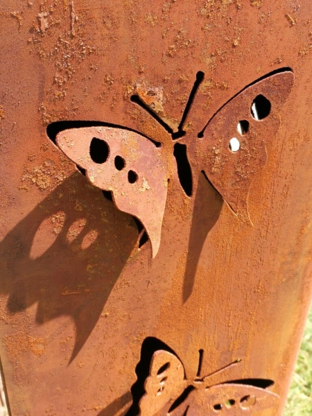 Die Edelrost Säule Schmetterling hat eine liebevolle und optische Besonderheit auf 2 Seiten.