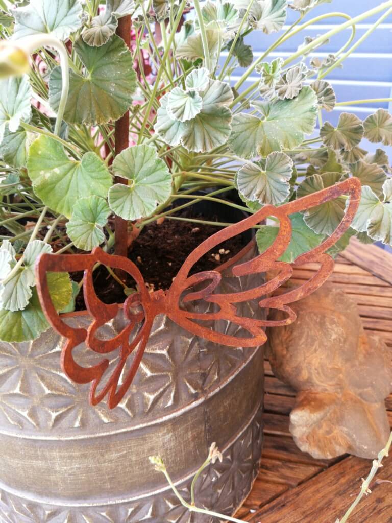 Die kleinen Edelrost Flügel haben auf der Rückseite einen kleinen Haken, um sie an vielen Stellen einhängen zu können.