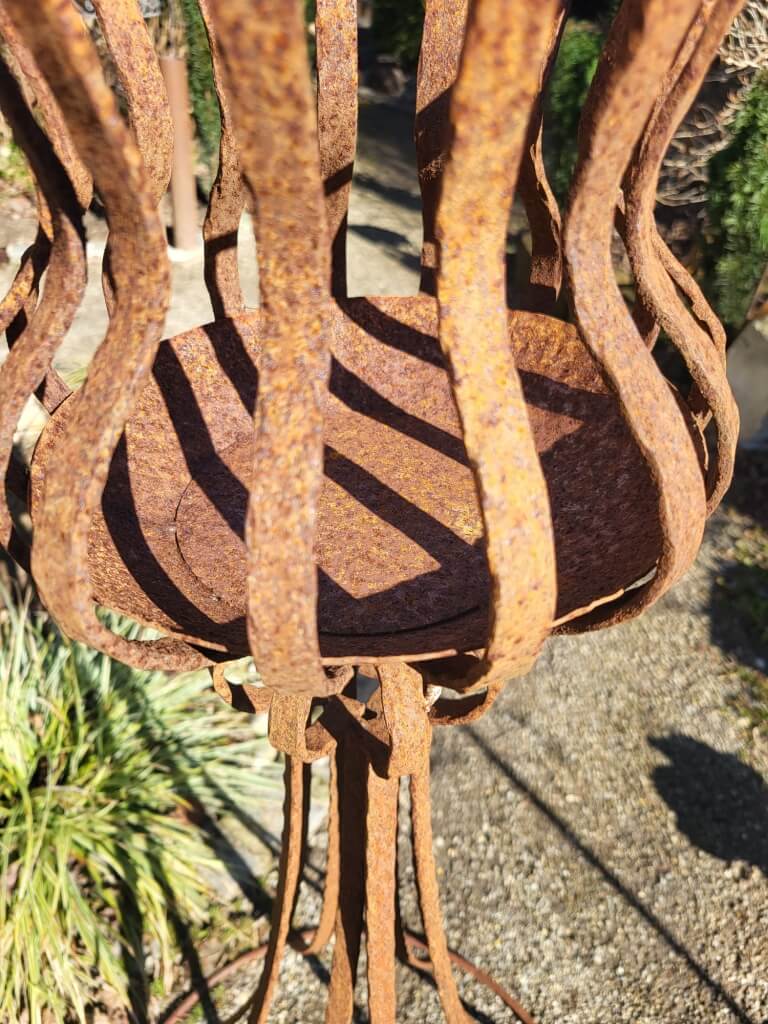 Ein sehr massiver Edelrost Ständer inkl. Korb, welcher wunderbar mit in Wachs getränkten Klorollen befeuert werden kann.