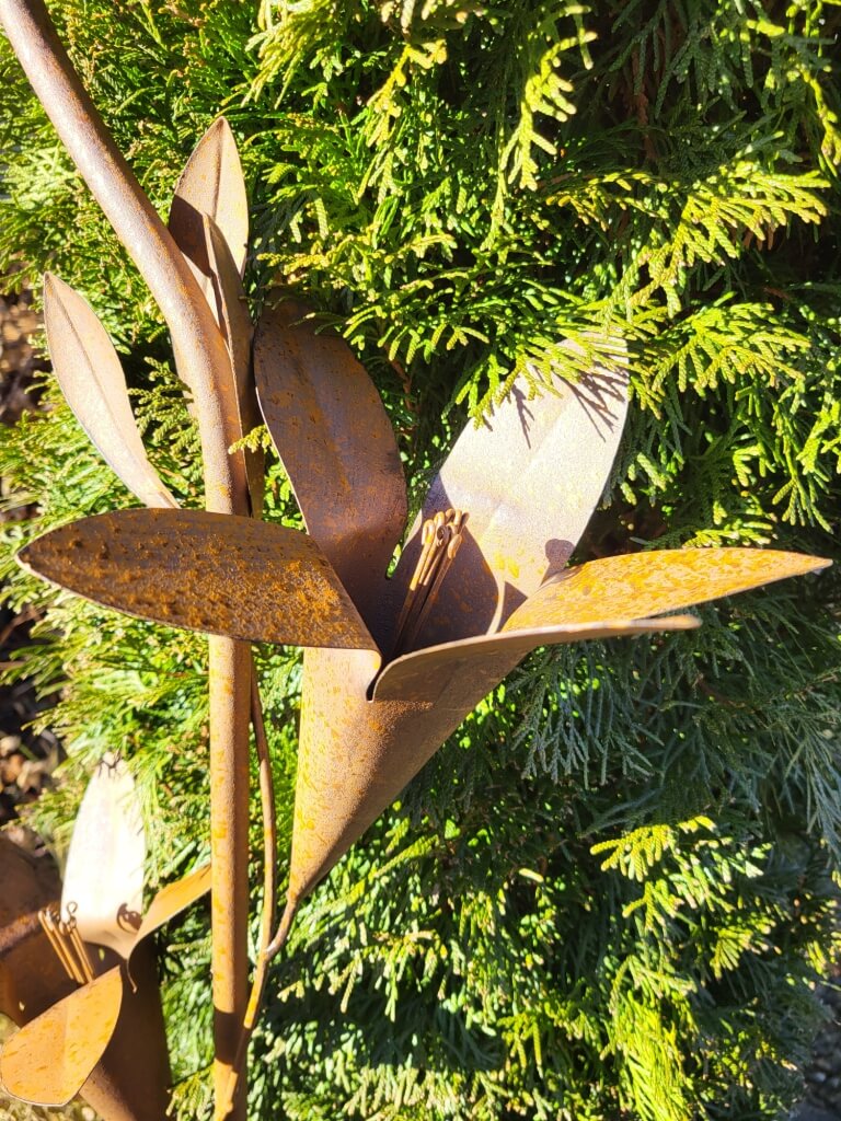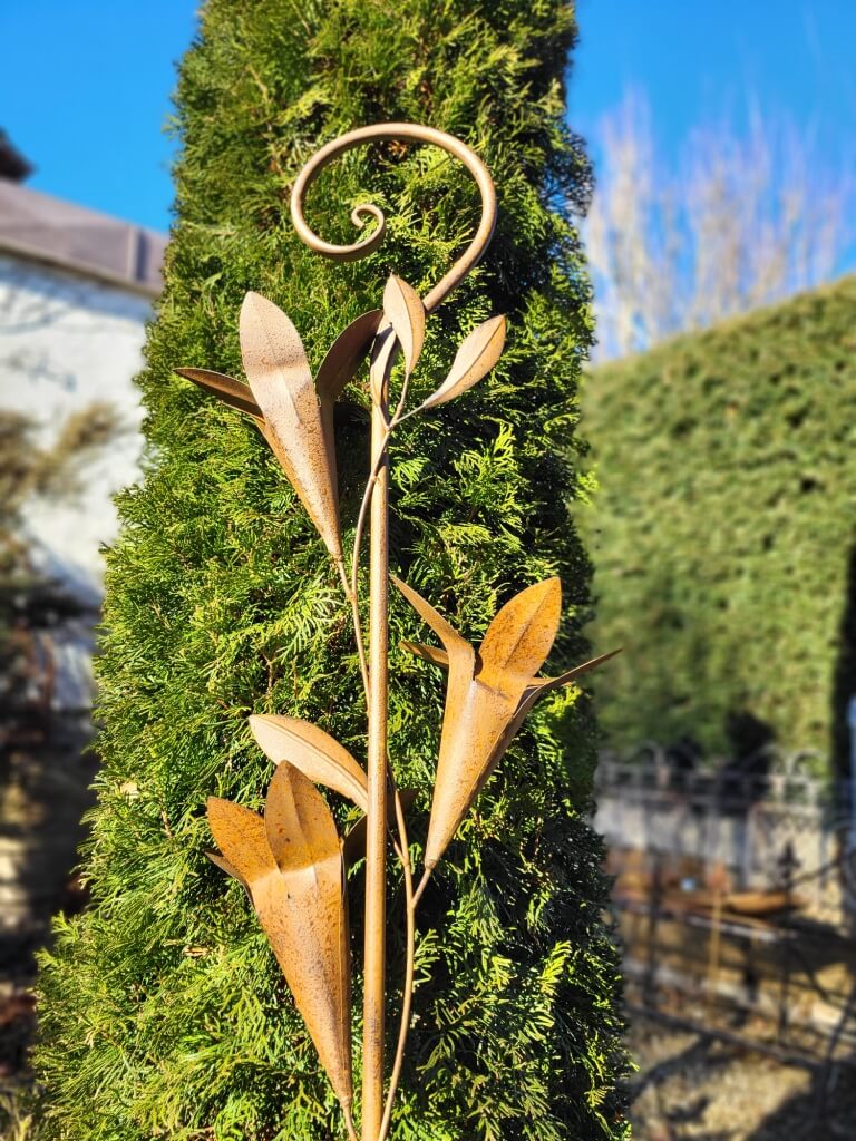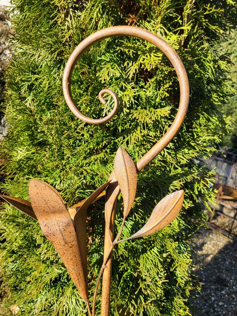 Ein romantisch und sehr aufwendig verzierter Rankstab für das Blumenbeet aus Edelrostoptik .