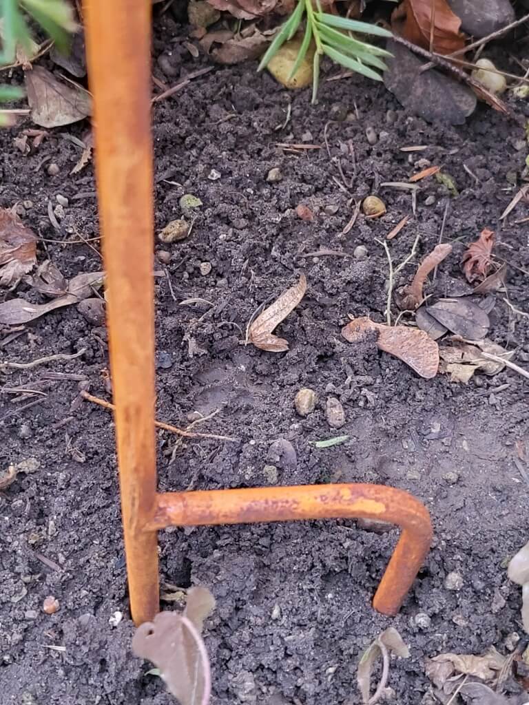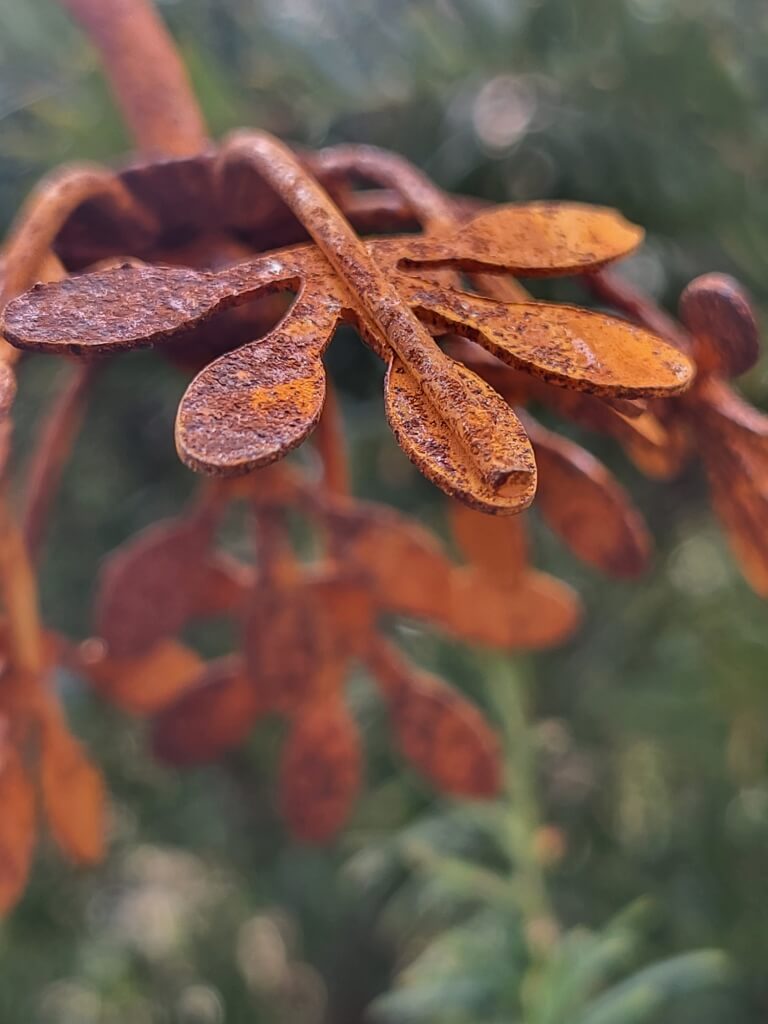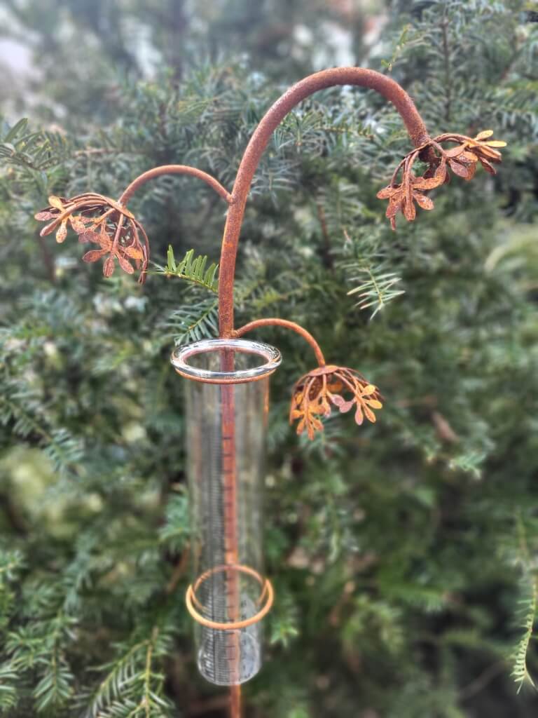 Der massiv gearbeitete Regenmesser aus Edelrost wird geziert von 3 filigranen Blüten.