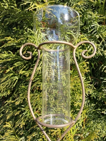 Blätterranken und ein Schmetterling zieren den mit einem Doppelspieß ausgestatteten, funktionalen Regenmesser.