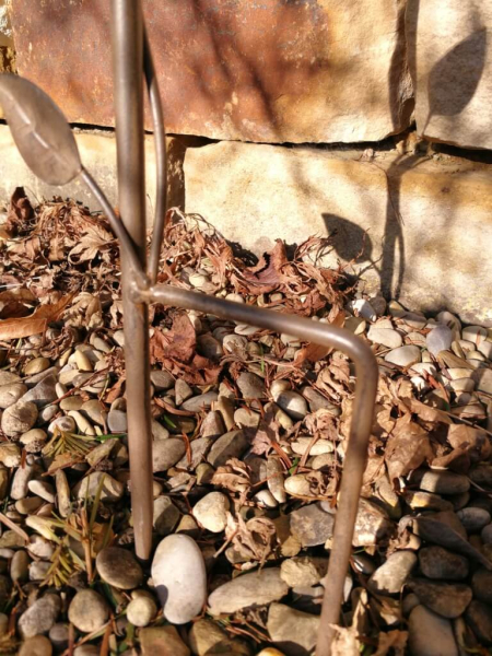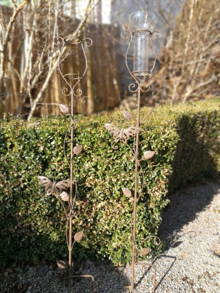 Ein romantisch-verspielter Metall-Gartenstecker in braun-schwarz mit Schmetterling und kleinen Blättern und einer nützlichen Funktion.