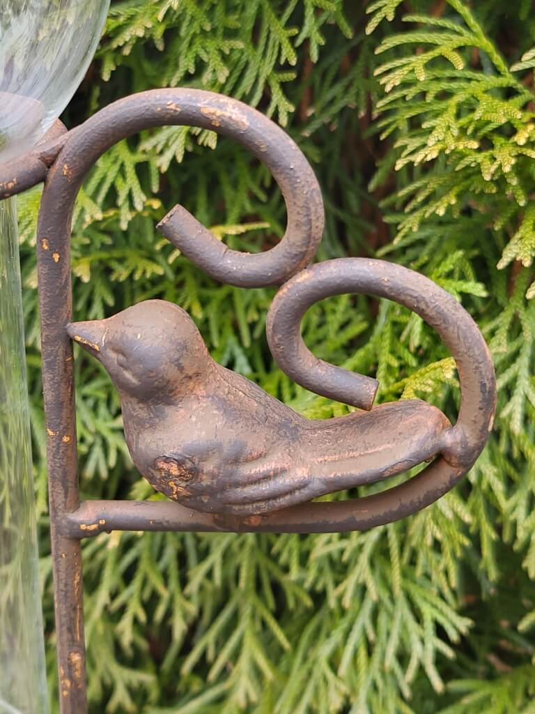 Ein romantisch-verspielter Metall-Gartenstecker in braun-schwarzem Gusseisen mit Herzen, kleinen Vögelchen und einer nützlichen Funktion.