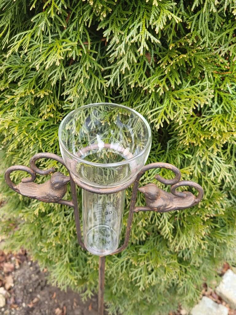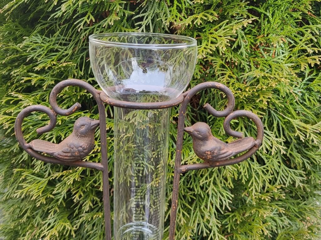 Seitliche Herzen, in denen kleine Vögelchen sitzen, zieren den funktionalen Regenmesser.