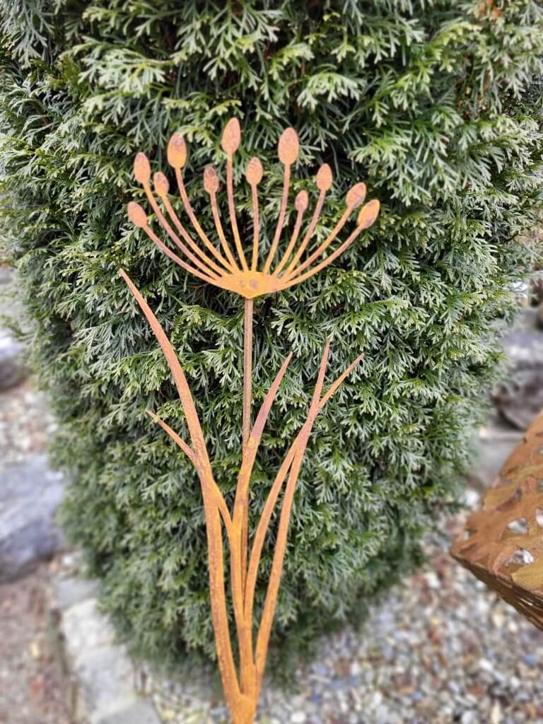 Ein filigran gearbeiteter Gartenstecker mit einer zarten Wiesenblume.