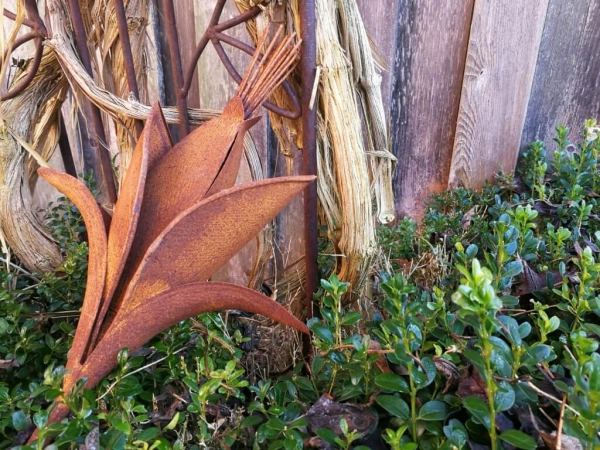 Eine ganz besondere Blüte aus Edelrost ist diese Blume noch in Knospenform.