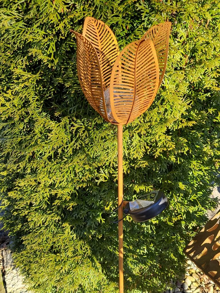 Eine traumhafte Kombination aus Edelrost und einer kleinen, farblosen Glaskugel, ist diese Solarblume zum Stecken ins Blumenbeet.