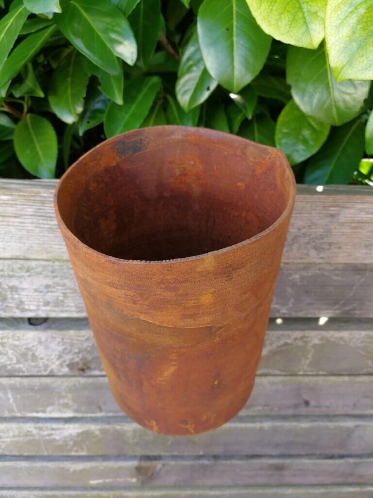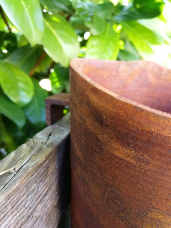 Der massive Pflanztopf aus Edelrost kann Dank des angeschweißten Hakens spontan an vielen Stellen aufgehängt werden.