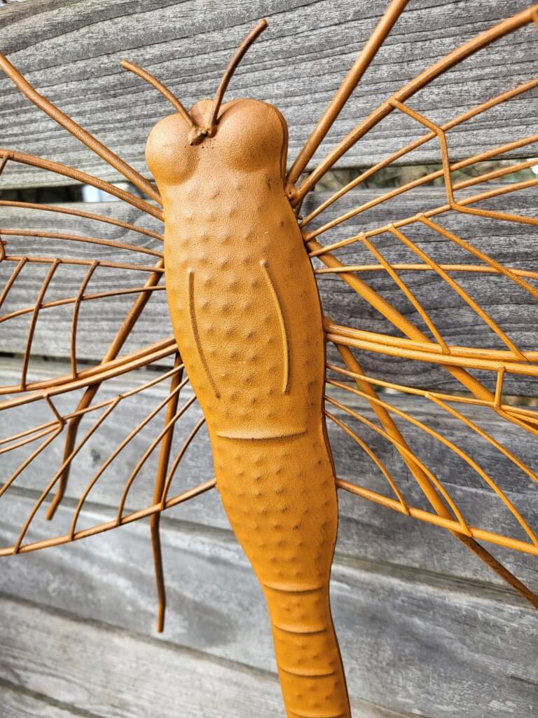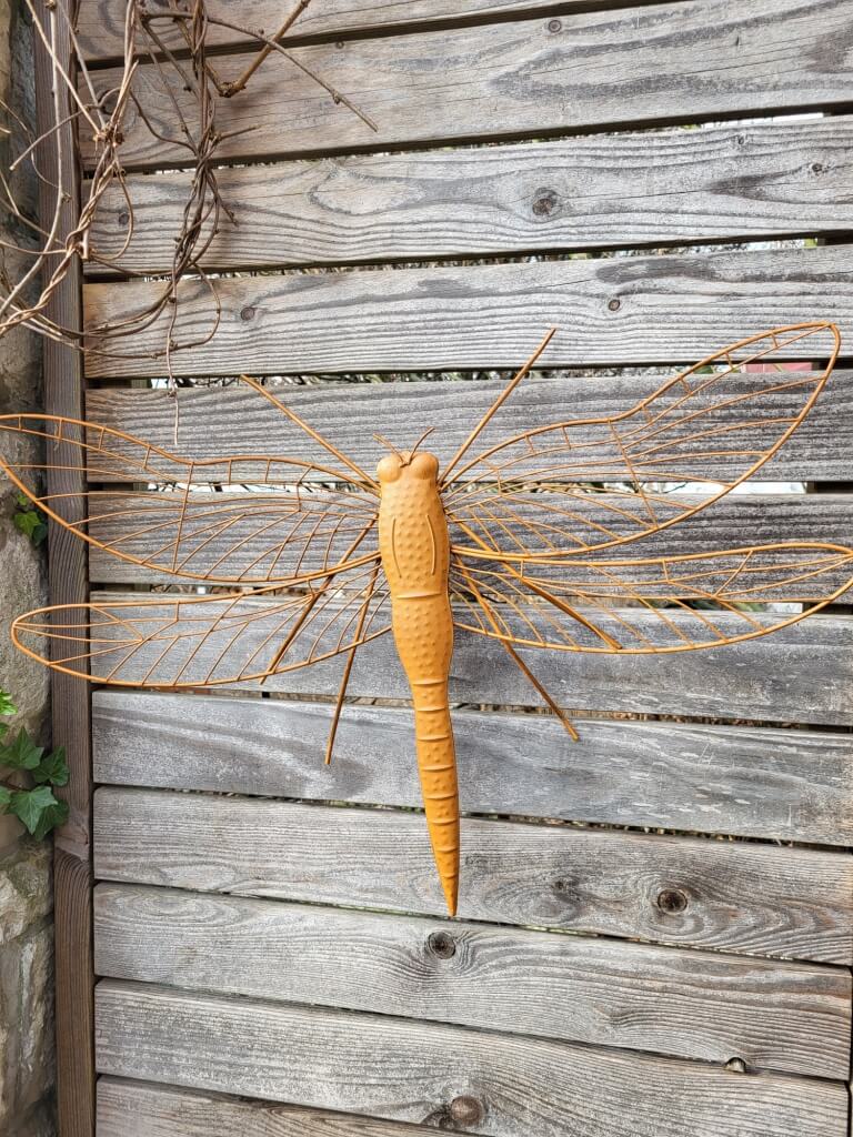 Die Libelle ist in Edelrostoptik lackiert und somit bestens zur Wanddekoration geeignet.