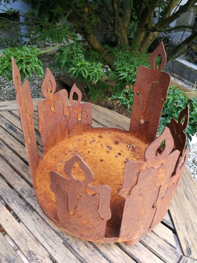 Der Edelrost Kerzenteller kann als Adventskranz genutzt werden oder ziert einfach nur mit ein wenig Beleuchtung eine Fensterbank, einen Tisch oder auch eine Mauer.