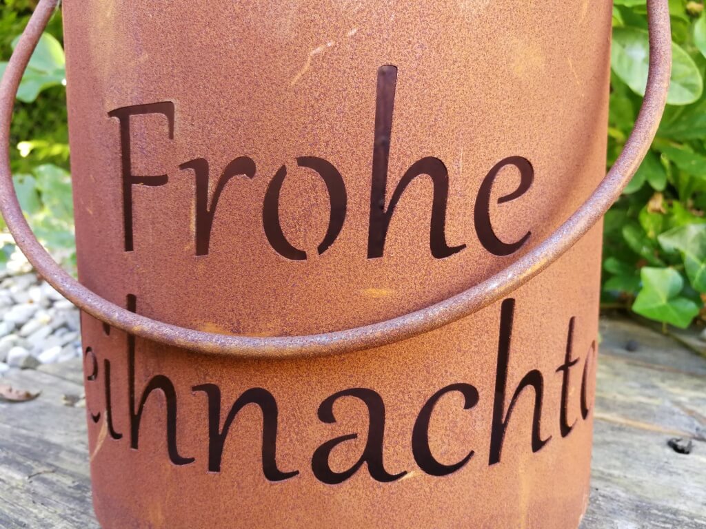 Der filigran ausgeschnittene Schriftzug Frohe Weihnachten gibt bei Kerzenbeleuchtung ein schönes Schattenspiel.