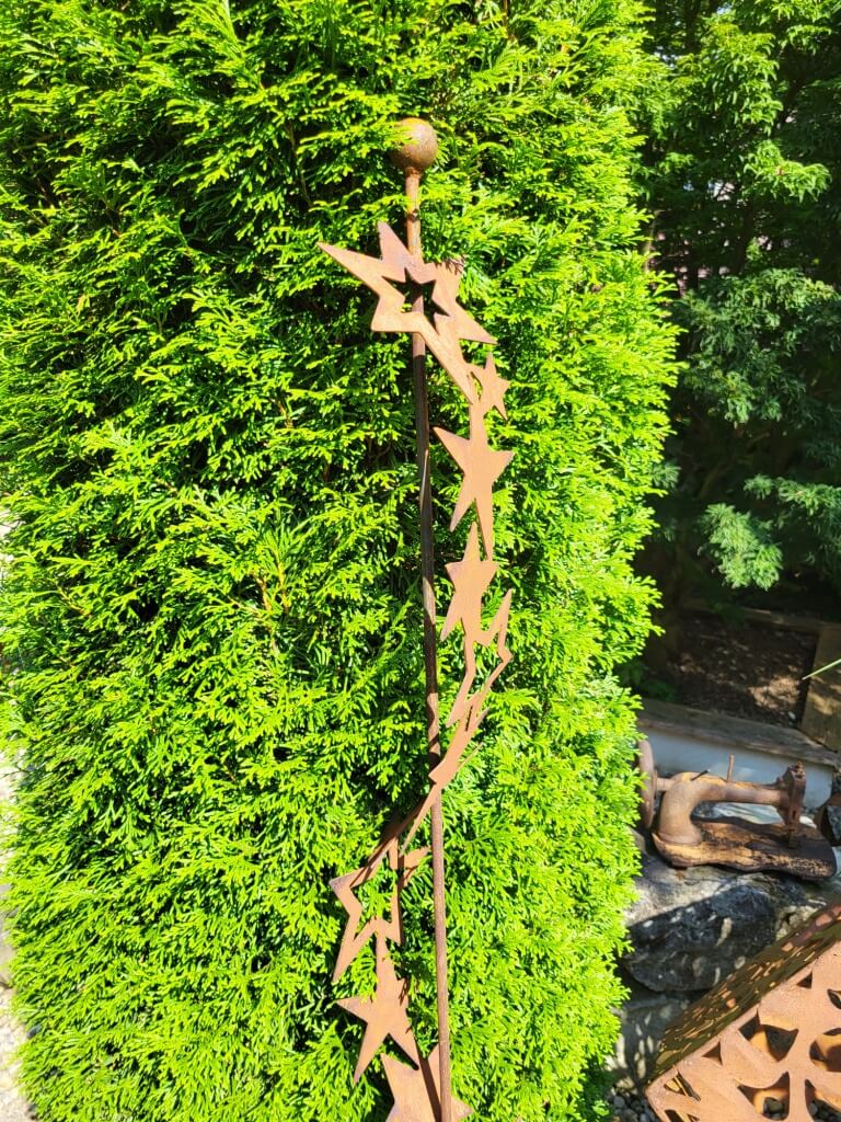 Bei diesem Gartenstecker sind zahlreiche unterschiedlich gestaltete Sterne aneinander geschweisst und wellenförmig um den Stab als Band angebracht.