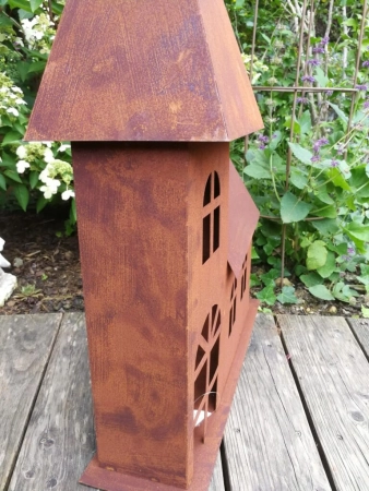 Eine auffällige und außergewöhnliche Laterne ist diese Edelrost Kirche, welcher auf der Rückseite offen ist und stimmungsvoll beleuchtet werden kann.