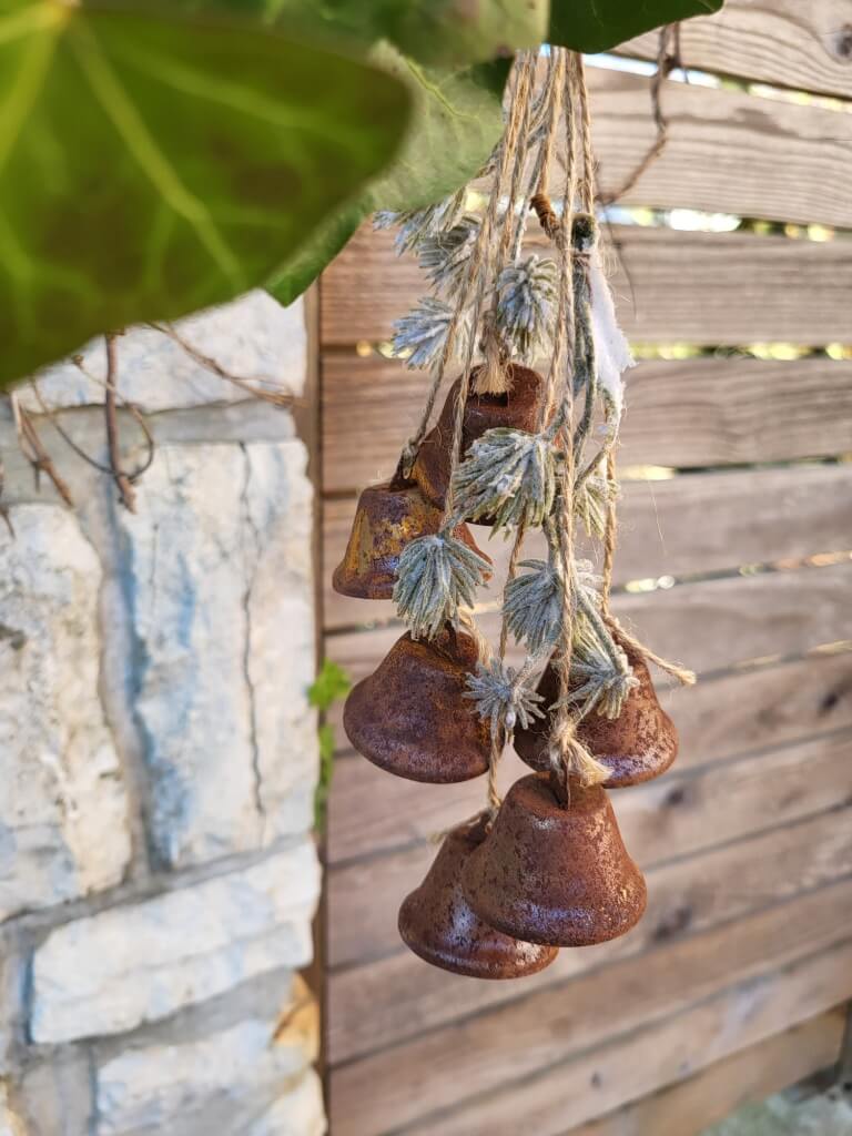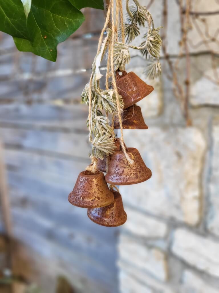 Diese Edelrost Glocken sind mit einem künstlichen Zedernzweig versehen und eignen sich hervorragend für eine rustikale Landhausdeko.