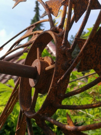 Zahlreiche, kleine Sterne zieren das imposante, doppelte Windrad aus Edelrost.