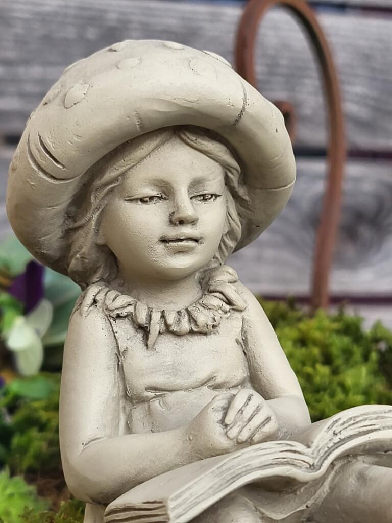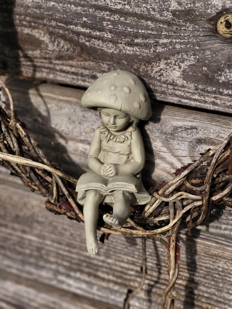 Der kleine Kantenhocker Blütenelfe Fliegenpilz trägt den Pilzhut als Kopfbedeckung und liest genüsslich ein Buch.