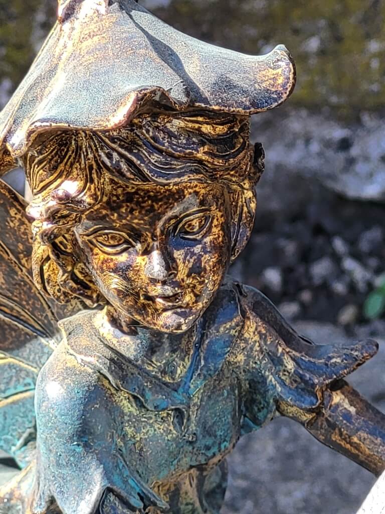Eine ganz bezaubernde Deko aus Polyresin ist diese in bronzeoptik gearbeitete Elfe auf Schnecke.