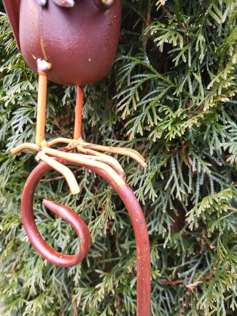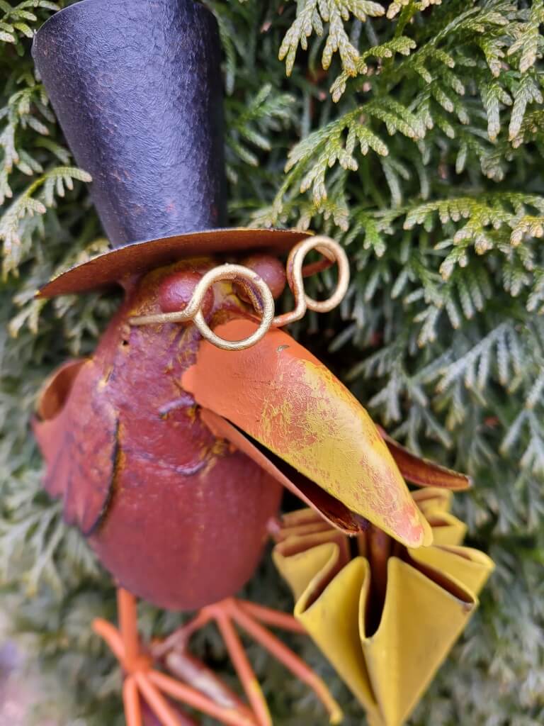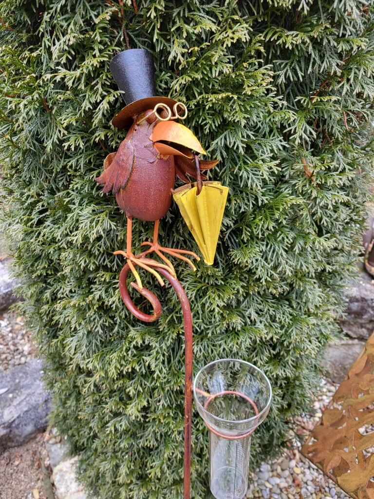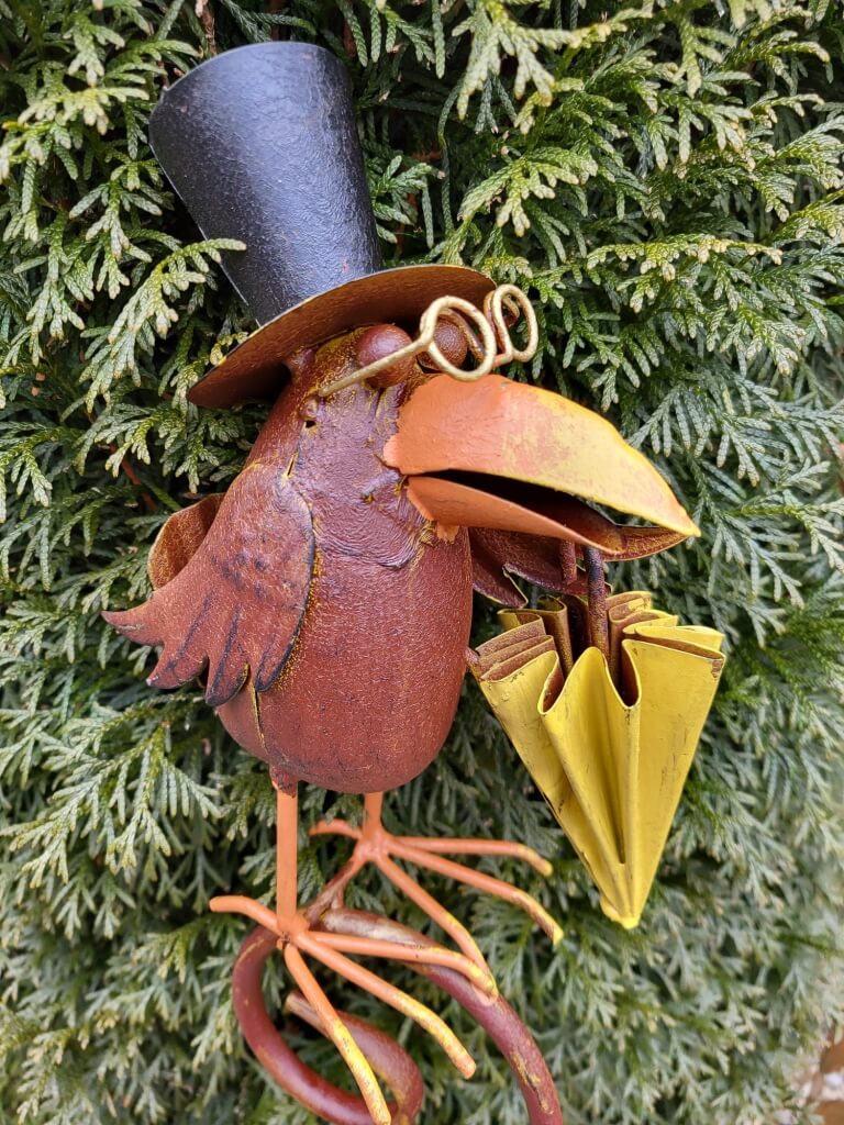 Der Metall Rabe ist mit einem Schirm und einem Zylinder ausgestattet.