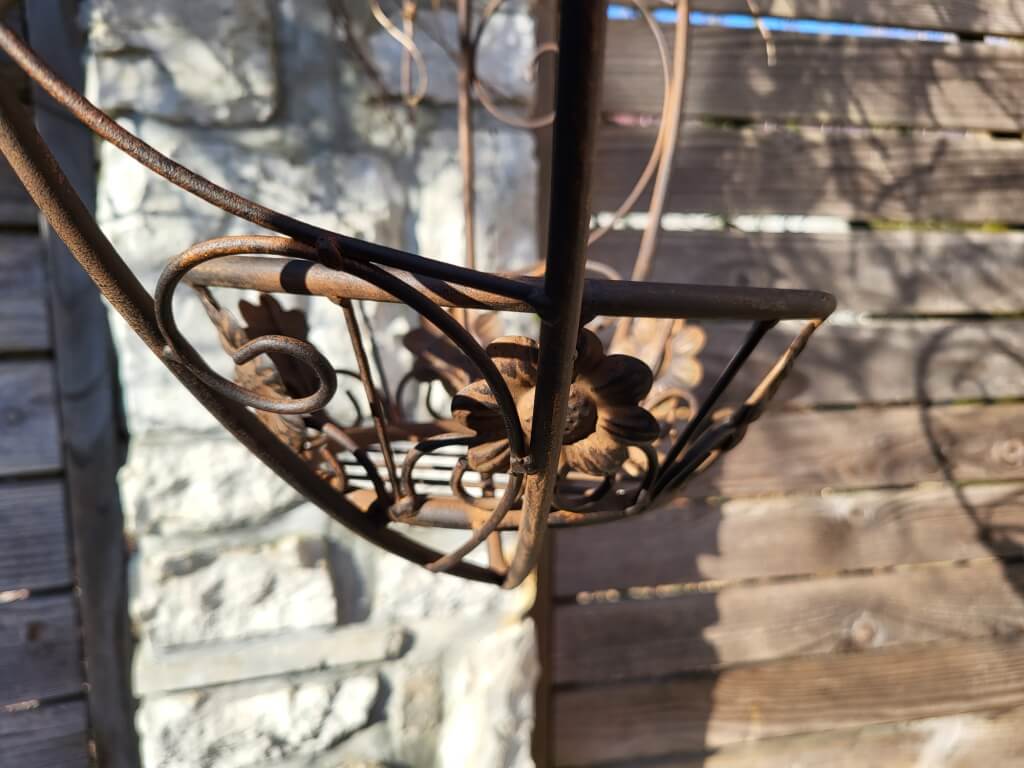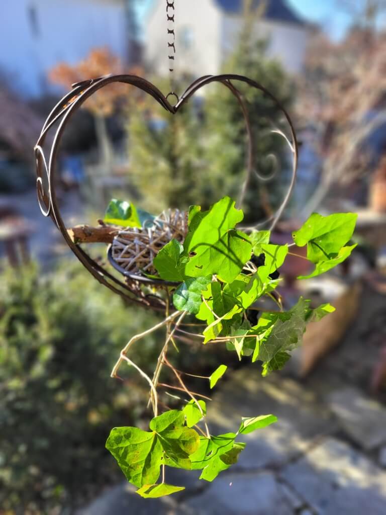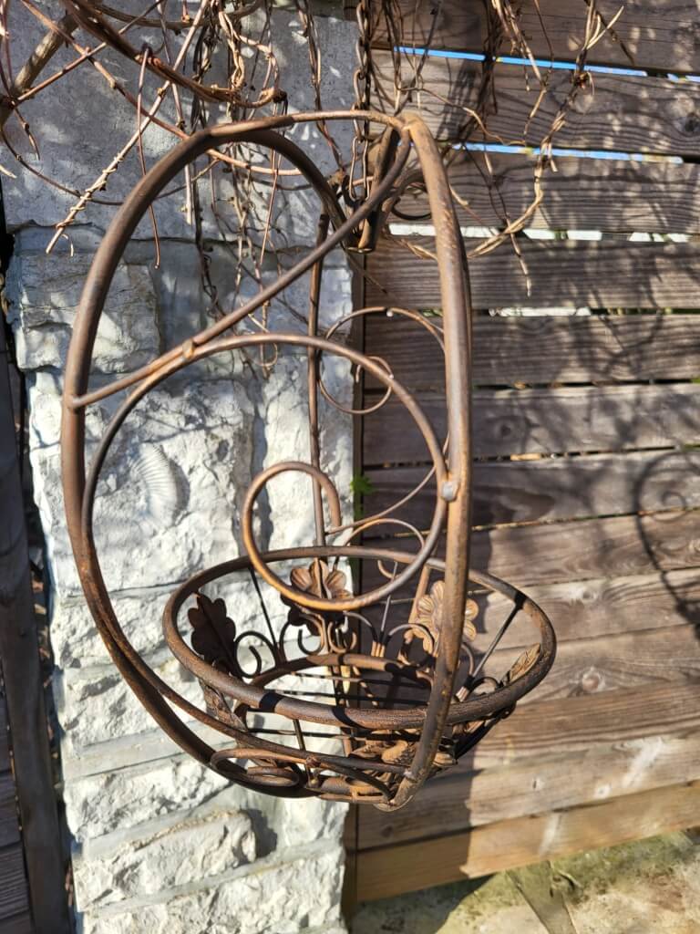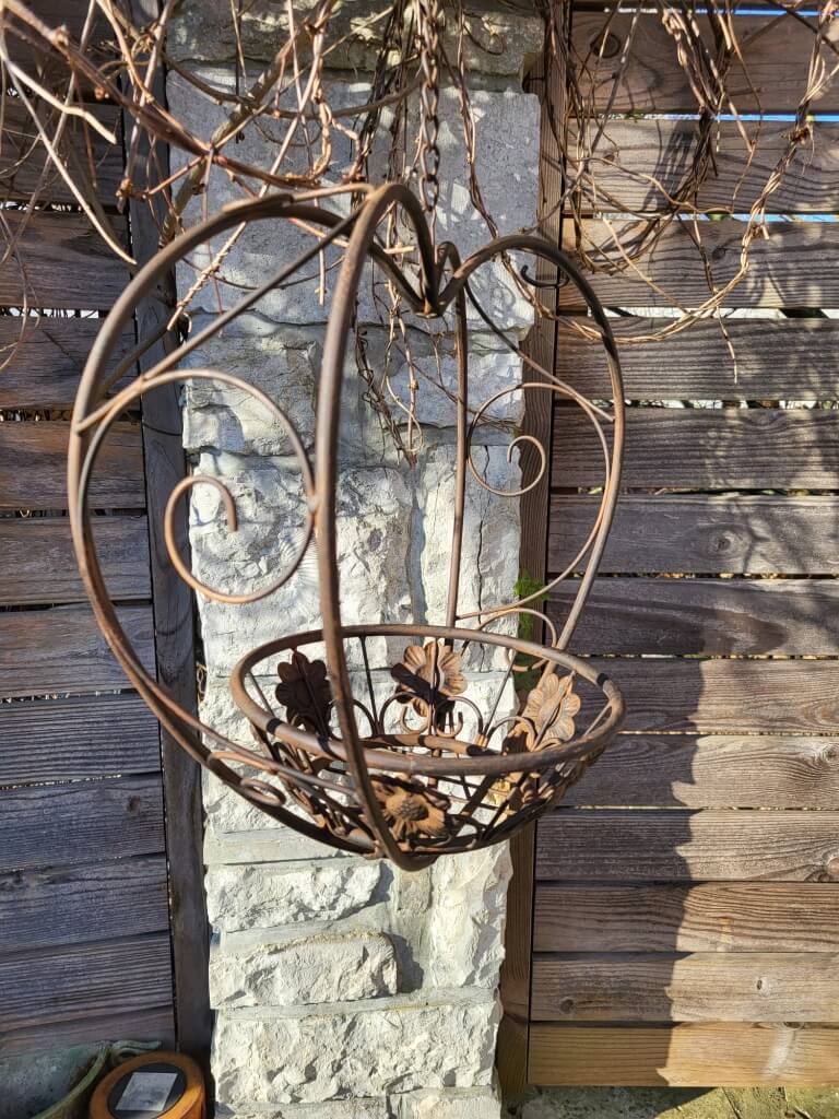 Das breite Herz zum Hängen mit Korb, welcher mit kleinen Blüten verziert ist, ist aus dunkelbraun-schwarz lackiertem Metall und hat zusätzlich ein schönes Schnörkelmuster.