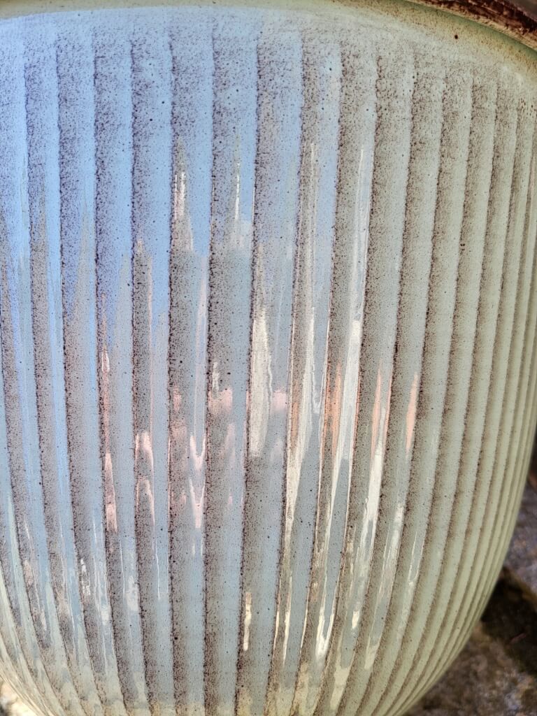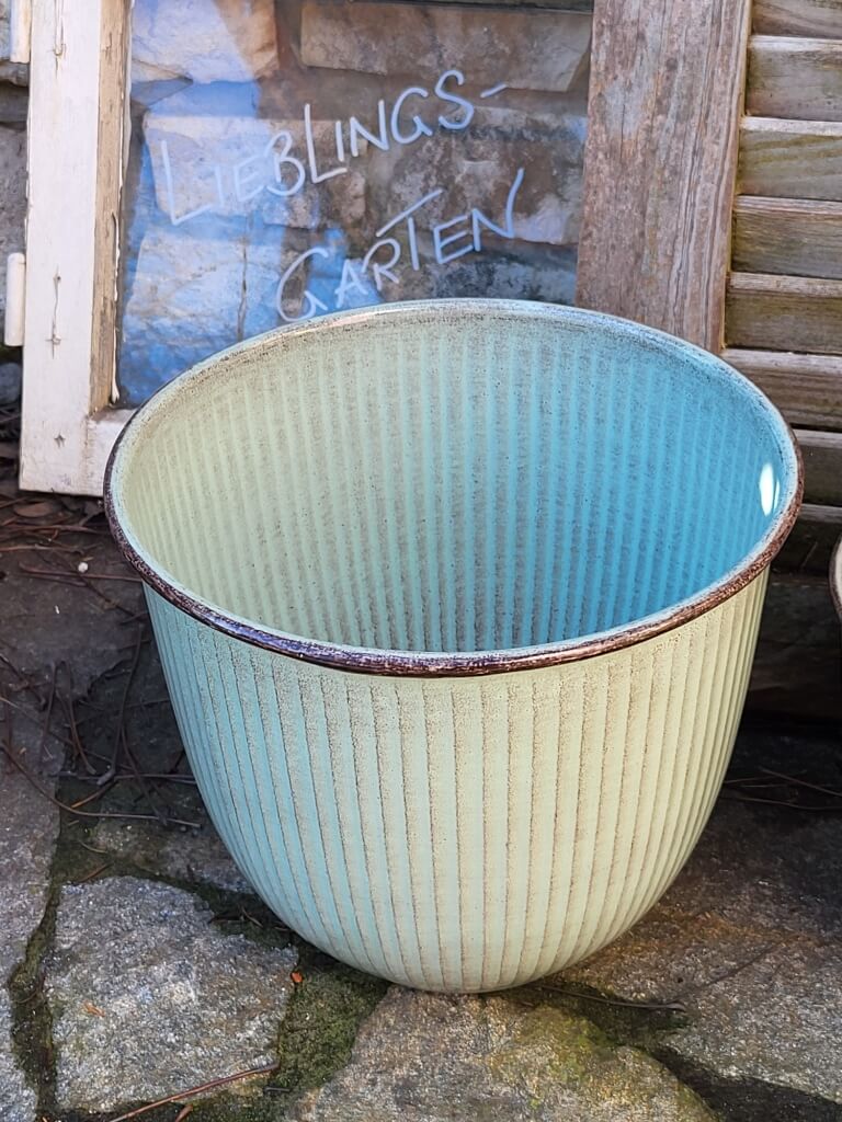 Leicht braun-graue Akzente betonen das dezente Rillenmuster, die den runden Kübel zieren.