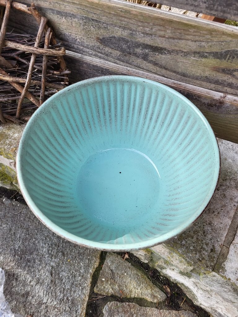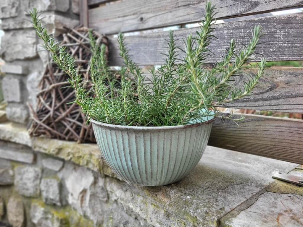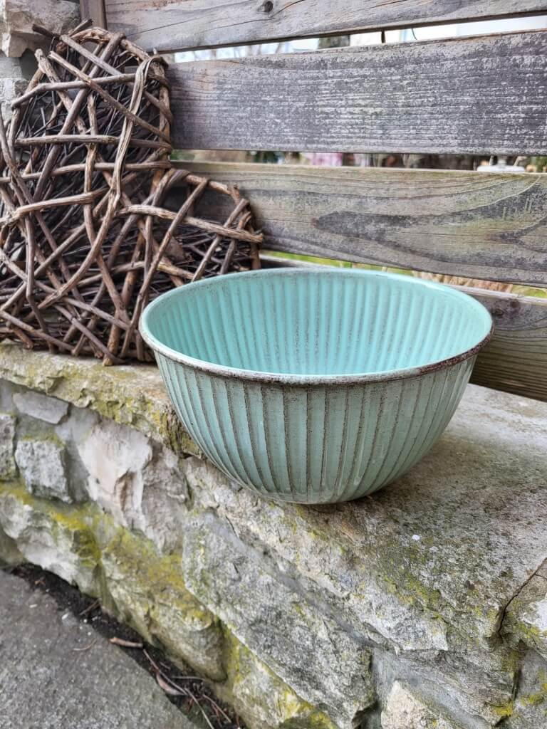 Eine außergewöhnlich-schlichte Vintage-Pflanzschale aus Metall in einem frische Grünton.