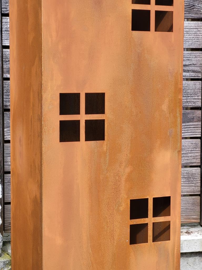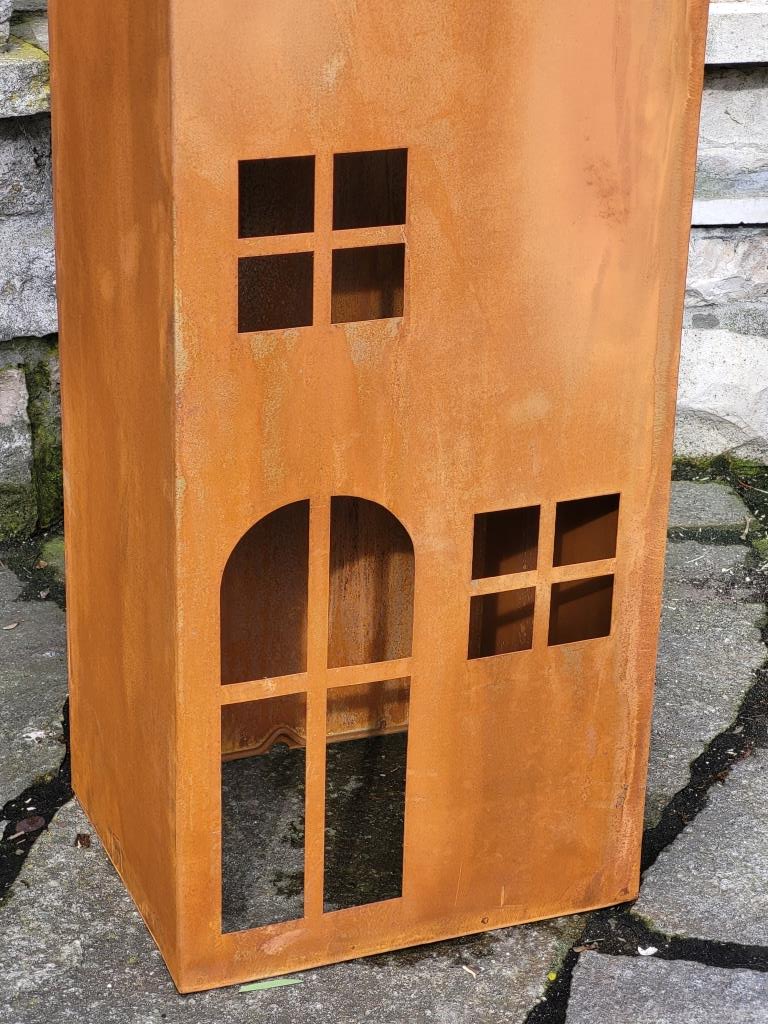 Ein schlichtes und modernes Edelrost Haus, allerdings in sehr stattlicher Größe, welches wunderbar als Laterne genutzt werden kann.