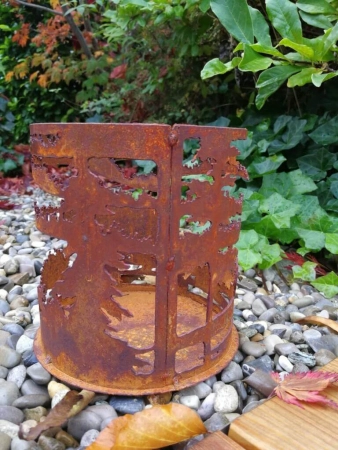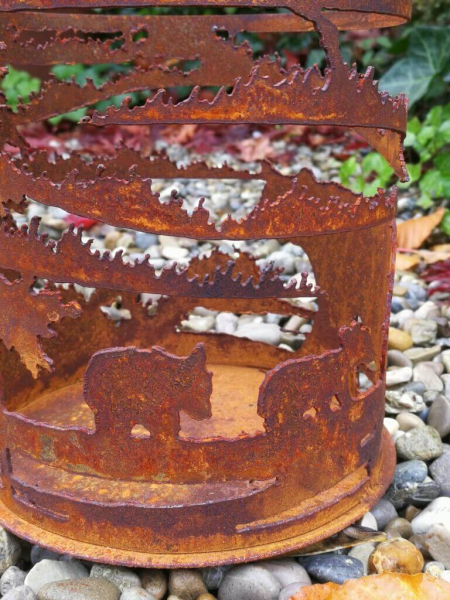 Ein besonders aufwendiges und filigranes Edelrost Windlicht, das jeden Liebhaber von Waldszenen und Wölfen erfreut.