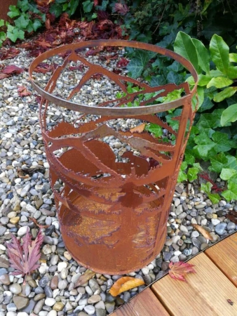 Ein besonders aufwendiges und filigranes Edelrost Windlicht, das jeden Liebhaber von Waldszenen erfreut.