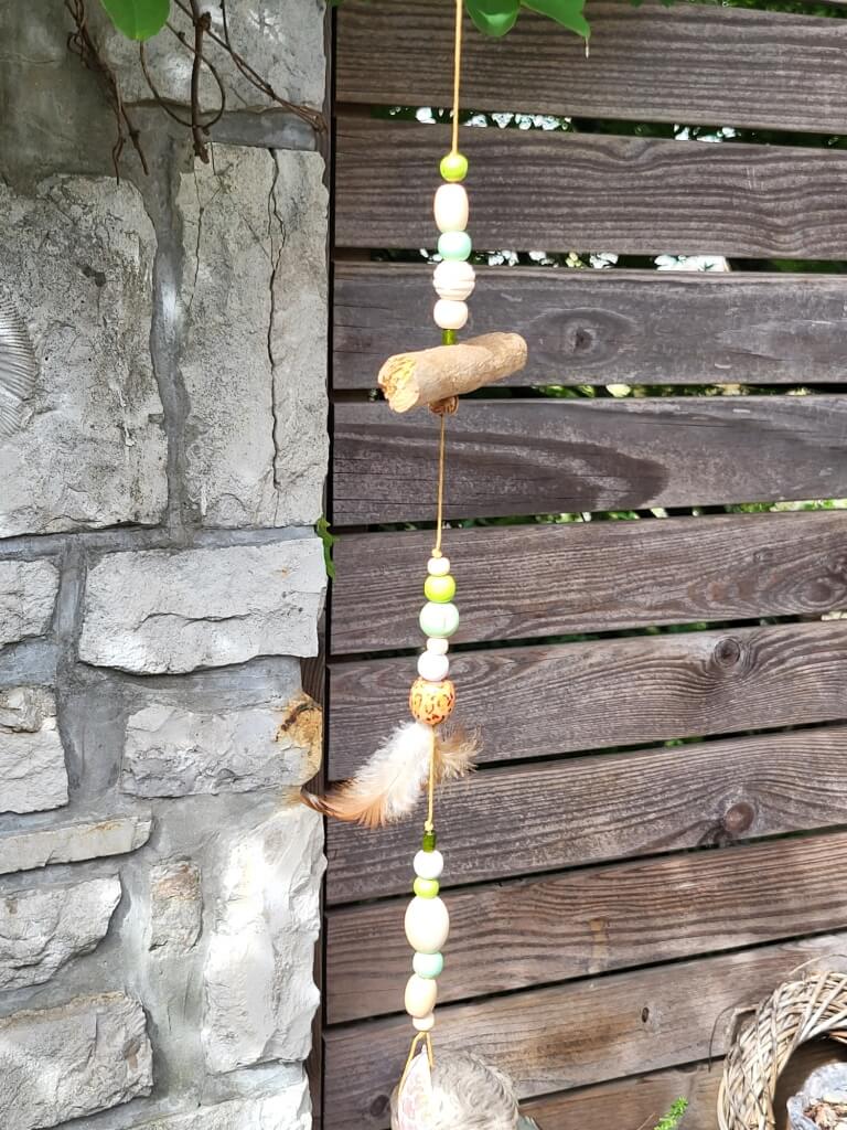 Dieser Hänger ist ebenfalls aus Holz-Perlen, Treibholz und Federchen gearbeitet und ist eine traumhafte Deko für das ganze Jahr, welche wunderbar zum Boho- oder Hippie-Stil passt.
