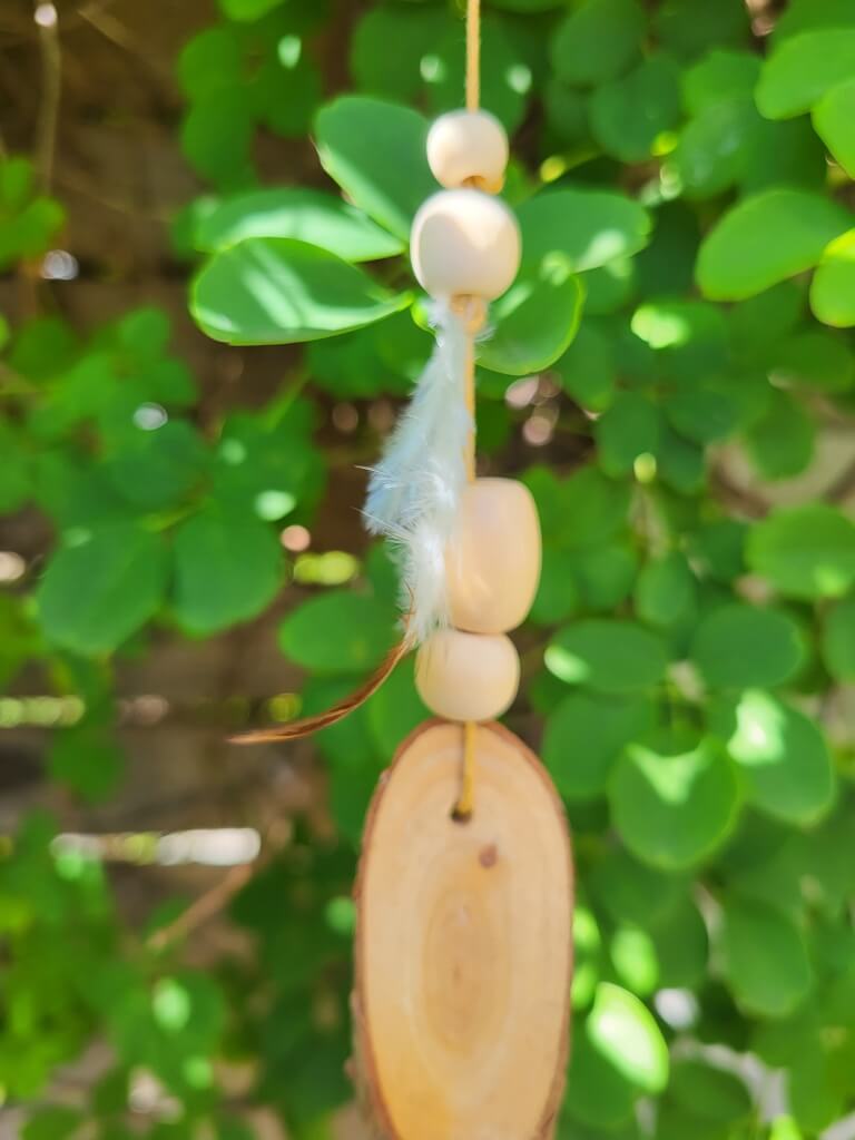 Der Boho-Hänger ist aus Naturmaterialien gestaltet, mit zahlreichen Holz Perlen, Treibholz, Federn und Muscheln.