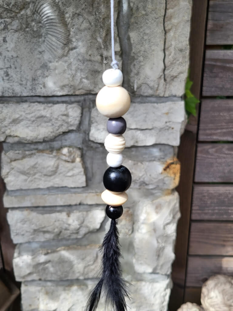 Der Hänger ist aus schwarzen und weißen Holz-Perlen gefertigt, ergänzt mit Treibholz und schwarzen Federn.