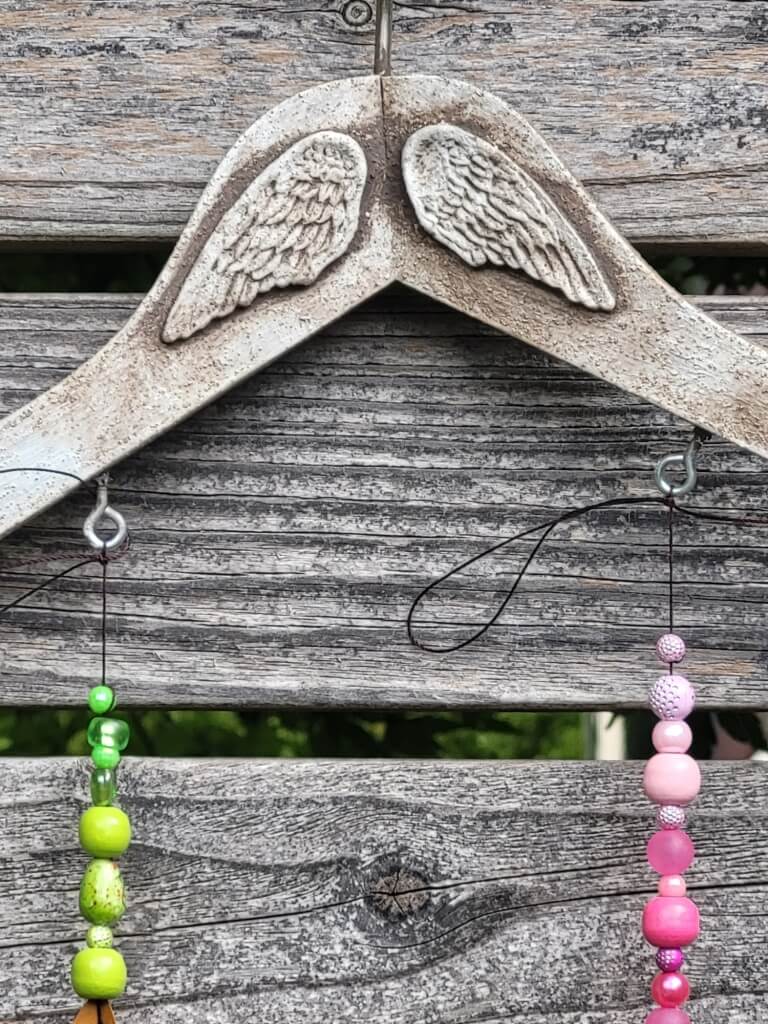 Als Aufhängung dient ein selbstgestalteter Kleiderbügel, an dem die 4 Stränge befestigt werden können.
